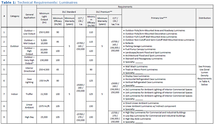 在DLC認(rèn)證規(guī)範(fàn)文件內(nèi),對(duì)於室內(nèi)/室 外Luminaires 和 Retrofit kits,對(duì)於產(chǎn)品的亮度/光效/壽命均提出了一定的要求;