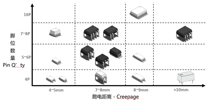 因應(yīng)不同的安全規(guī)範(fàn)需求,使用者會(huì)挑選不同爬電距離的光耦;因應(yīng)不同的功能需求,