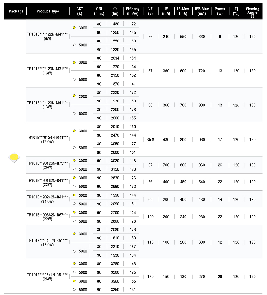 • 不同功率方案,單顆實(shí)現(xiàn)2270-3070流明光通量輸出